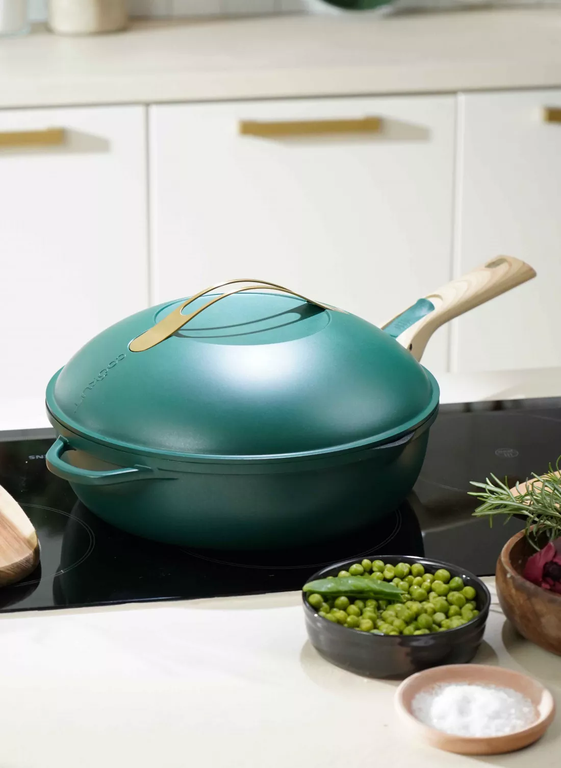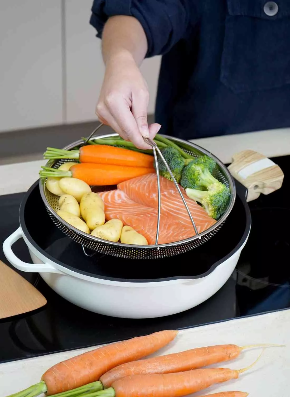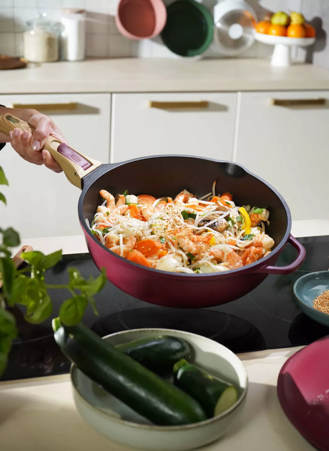 Inclus : 2 poignées détachables (une longue et une courte), un panier vapeur et une spatule en bois.