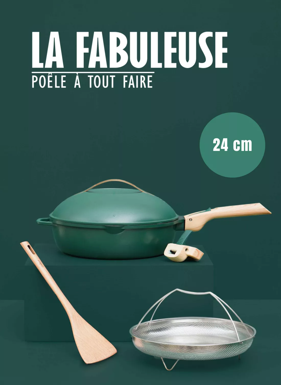 LA FABULEUSE, LA POÊLE A TOUT FAIRE QUI REMPLACE 8 USTENSILES : POÊLE, SAUTEUSE, CASSEROLE, COCOTTE, CUISEUR VAPEUR, FRITEUSE, PLAT AU FOUR, MOULE A GATEAUX